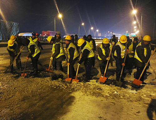 此次低溫雨雪天氣期間,集團(tuán)公司負(fù)責(zé)的12座橋梁、長江隧道、三環(huán)線南、北、東段主道積雪及時(shí)清理完畢,交通安全暢通,集團(tuán)公司及橋建集團(tuán)、道橋公司、城運(yùn)公司、新區(qū)公司、城鐵公司、臨空投公司等建設(shè)單位累計(jì)組織投入人員5733人次,巡視、撒鹽車輛835車次,鏟車、裝載機(jī)、農(nóng)用車242臺(tái)次,撒鹽549噸,撒融雪劑64噸,鋪設(shè)草袋10350條,確保了城市三環(huán)線和重要跨江橋梁和長江隧道的安全暢通。