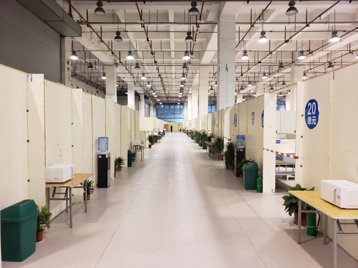 15日完成上下兩層病患區(qū)共1047個(gè)床位隔斷、給排水、供電、通信、監(jiān)控、化糞池等主體功能,16日物資采購基本到位,“方艙”生活用品、衛(wèi)生間、洗漱、淋浴、空調(diào)取暖、熱水器、醫(yī)廢收集等功能配套安裝布設(shè)到位。緊接著,邀請(qǐng)中央、省、市三級(jí)疾控專家現(xiàn)場(chǎng)指導(dǎo),“三區(qū)兩通道”、新風(fēng)系統(tǒng)等逐步完善。建設(shè)者們克服一切困難,一周時(shí)間內(nèi)建成這座方艙醫(yī)院。市指揮部原下達(dá)1000張床位任務(wù),為盡力發(fā)揮功效,最終擴(kuò)為1047個(gè)。