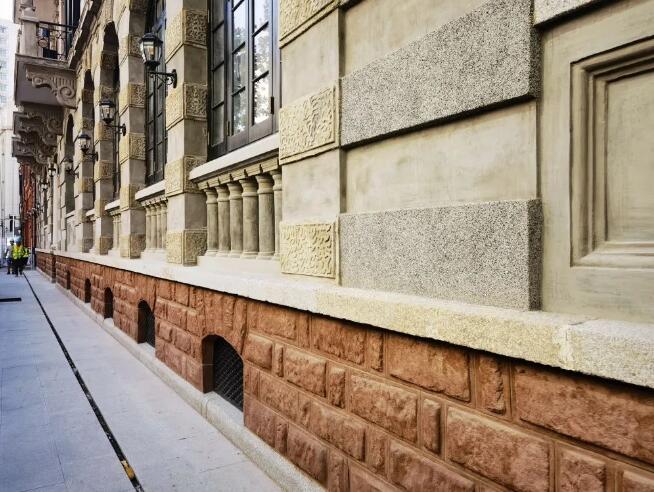 除了紅磚清水墻,水刷石線條也是巴公房子外墻畫龍點(diǎn)睛之筆。盡管這種裝飾線條在近現(xiàn)代古建筑上較為常見,但看似簡(jiǎn)單的修飾線條修復(fù)起來并不簡(jiǎn)單。天時(shí)公司施工人員在清理原有線條基層后,再對(duì)其表面進(jìn)行鑿毛處理,為確保水泥砂漿附著牢固,在涂抹水泥砂漿前,還需刷上界面劑,以達(dá)到更好的吸附效果。隨后再依次進(jìn)行彈線、粘條、二次涂抹水泥沙漿和麻石漿等工序,最后將面層拍平壓實(shí),在刷子涂刷過后,面層不落石子的情況下再進(jìn)行噴刷,待水分干透后再取出分格條,用水泥膏填補(bǔ)縫隙。在水刷石線條的施工過程中,基層的處理和麻石漿的配比尤為重要,為避免出現(xiàn)差池,施工人員精細(xì)入微,對(duì)各個(gè)環(huán)節(jié)精確把控,反復(fù)核準(zhǔn),有效避免了空鼓和色澤不均等問題。